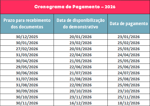 Nota: Para que a manutenção e concessão sejam realizadas na data de pagamento acima, é necessário que a documentação seja recebida por completo na data estipulada neste cronograma.